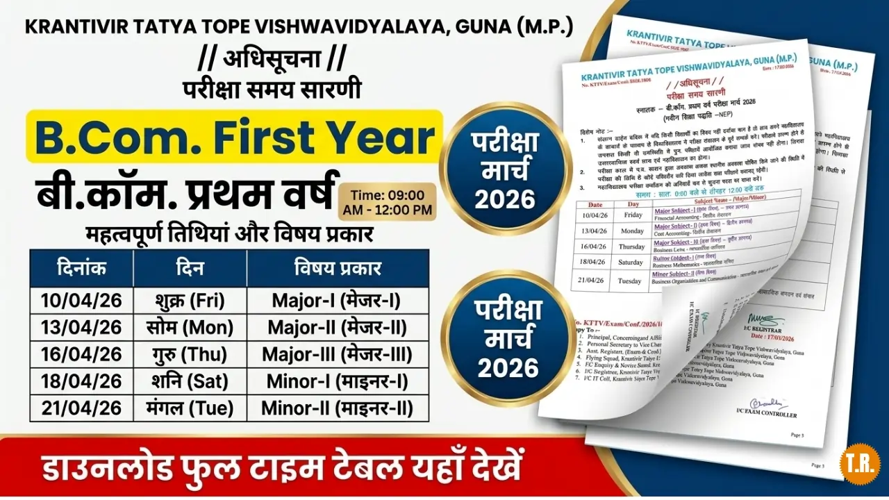 Krantivir Tatya Tope Vishwavidyalaya (KTTV), Guna (M.P.) has officially released the time table and notification for the B.A. First Year (New Education Policy – NEP) March 2026 examinations. Students pursuing their Bachelor of Arts (B.A.) 1st year from colleges affiliated with KTTV can now check their complete exam schedule. In this article, we have provided … Read more