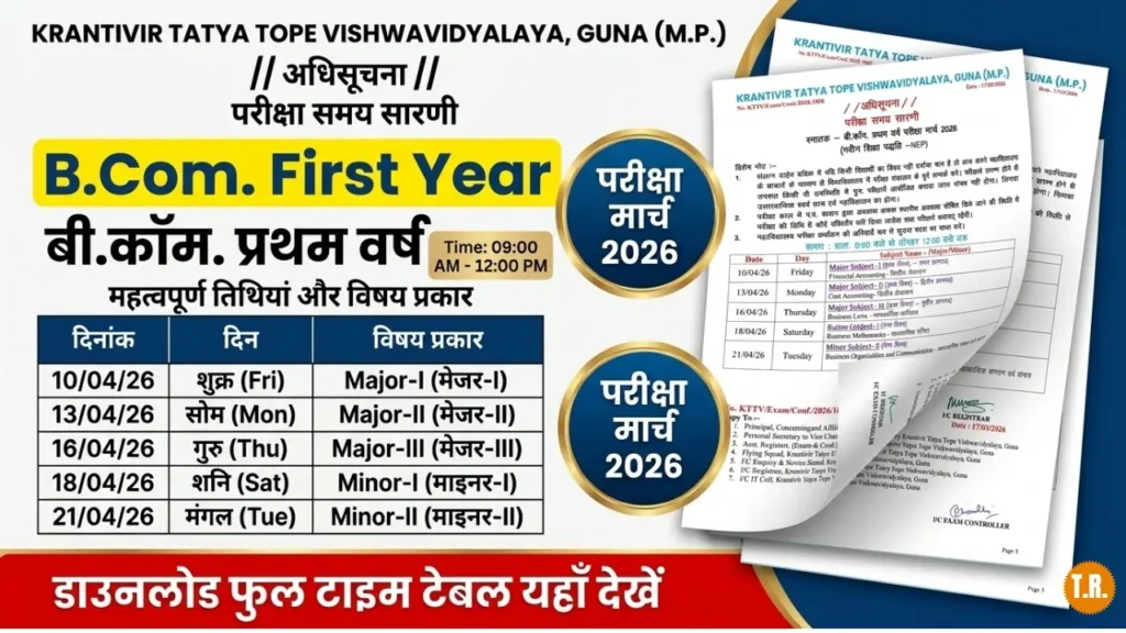Krantivir Tatya Tope Vishwavidyalaya (KTTV), Guna (M.P.) has officially released the time table and notification for the B.Com First Year (New Education Policy – NEP) March 2026 examinations. Students pursuing their Bachelor of Commerce (B.Com) 1st year from colleges affiliated with KTTV can now check their complete exam schedule.
